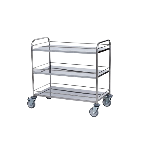 Descrição: Carro para transporte de bandejas com base, prateleira e tampo, fabricado totalmente em aço inoxidável.